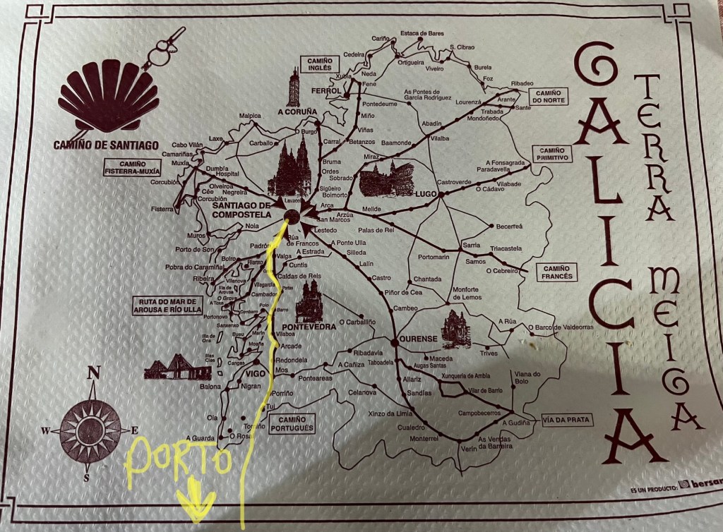 Day one MatosinhosLeaving Arcade… beautiful walk out. Not sure a beautiful city. So happy to have found Pillars apartment for the night Caldas de Reis hotel owner Hello Spain!Thank you Catherine!! Unfortunately I did not have reception and did not see this photo…. We took the red route 🤪Porto from RiverThe look of accomplishment upon arrival Wash and dry… repeat We found you !!This is what we looked like towards the end of pretty much every day Barcelos rooster 🐔